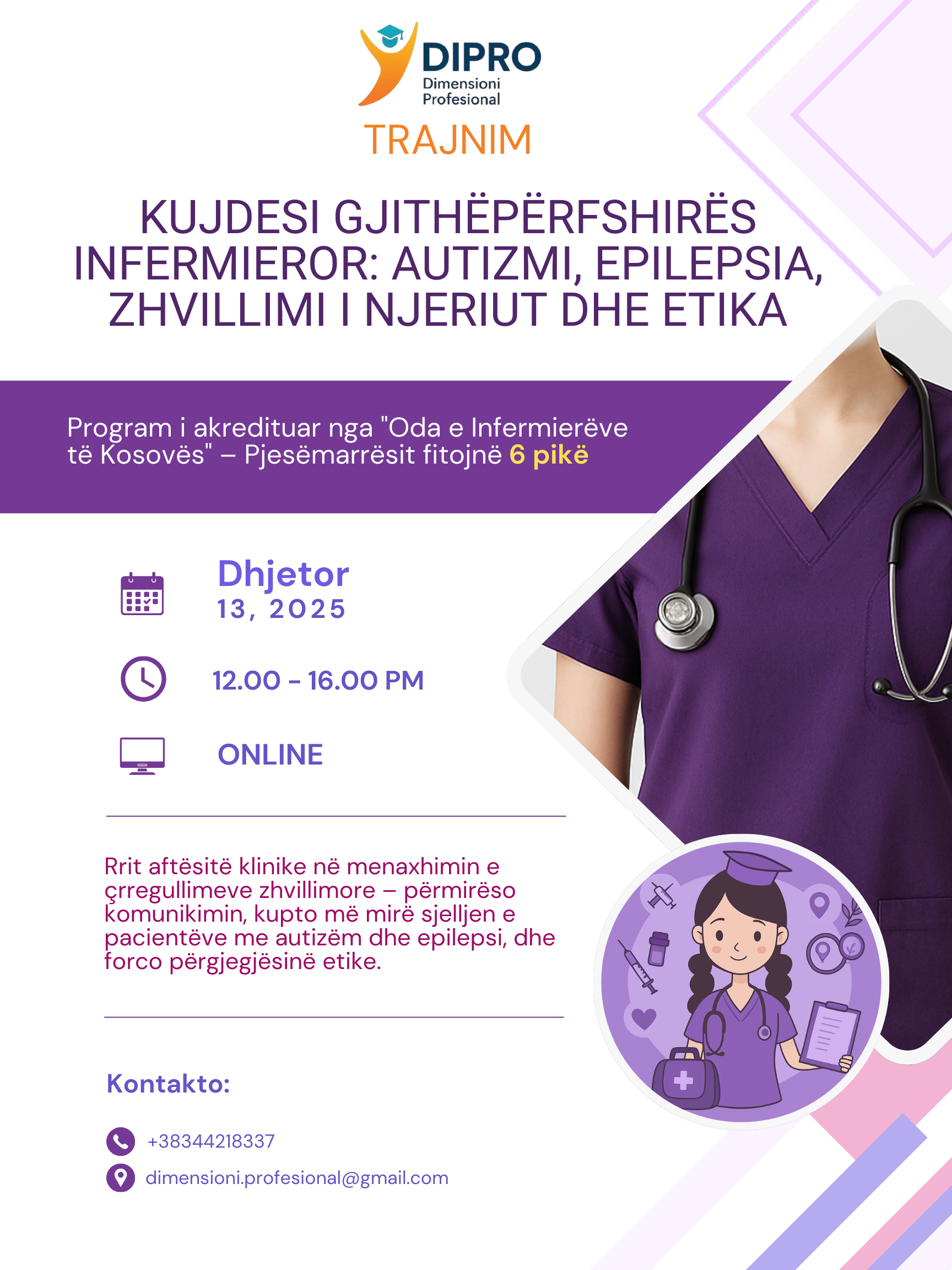 Ky trajnim forcon aftësitë e infermierëve në menaxhimin e çrregullimeve zhvillimore si autizmi dhe epilepsia, ndërkohë që thellon njohuritë mbi fazat e zhvillimit njerëzor bazuar në Frojd dhe Erikson. Me fokus në arsyetimin etik dhe përgjegjësinë profesionale.